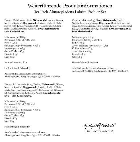 3er Pack Almaregårdens Lakritz Probier-Set aus Schweden (3 x 150g / süß, salz & mit Chili)