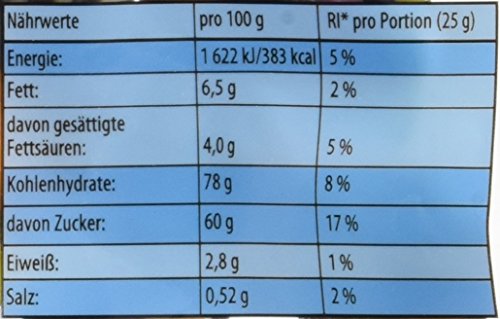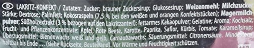 Zutaten Zucker; brauner Zuckersirup; Glukosesirup; Weizenmehl; Milchzucker; Stärke; Dextrose; Palmfett; Kokosraspeln (7,5 % bei den weißen und orangen Konfektstücken); Magermilchpulver; Süßholzextrakt (3 % bezogen auf den Lakritzanteil); fettarmes Kakaopulver; Gelatine; Aroma; Kochsalz; Frucht- und Pflanzenkonzentrate: Apfel, Paprika, Rote Beete, Karotte, Saflor, Tomate, Kürbis; Karamellsirup; Säuerungsmittel: Citronensäure; Überzugsmittel: Bienenwachs weiß und gelb, Carnaubawachs. Nährwerte pro 100g Energie: 1622kJ/383kcal Fett: 6,5g davon gesättigte Fettsäuren: 4g Kohlenhydrate: 78g davon Zucker: 60g Eiweiß: 2,8g Salz: 0,52g