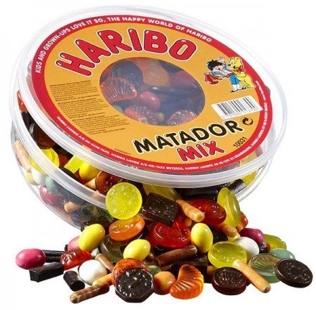 Erdbeerschnüre, Fruchtgummis und andere Süßwaren.