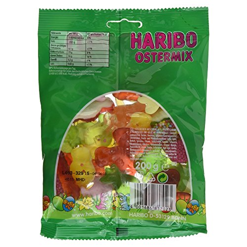Hier erhalten Sie eine 200g Tüte Haribo Ostermix, in der Sie Fruchtgummi-, Schaumzuckerfiguren in Oster-Optik und Gelee-Eier vorfinden. Dieser tolle Mix ist sowohl für Klein als auch Groß ein fruchtig-süßer Genuss.