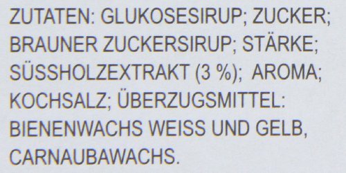 Glukosesirup; Zucker; Stärke; brauner Zuckersirup; Süßholzextrakt (3 %); Aroma; Kochsalz; Überzugsmittel: Bienenwachs weiß und gelb, Carnaubawachs.