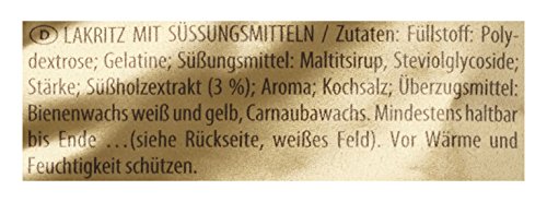 Polydextrose; Gelatine; Süßungsmittel: Maltitsirup, Steviolglycoside; Stärke; Süßholzextrakt (3 %); Aroma; Kochsalz; Überzugsmittel: Bienenwachs weiß und gelb, Carnaubawachs. Nährwerte pro 100g Energie: 757kJ/185kcal Fett: <0,5g davon gesättigte Fettsäuren: 0,1g Kohlenhydrate: 16g davon Zucker: 2,5g Eiweiß: 8,1g Salz: 0,62g Referenzmenge für einen durchschnittlichen Erwachsenen (8400kJ/2000kcal) Verantwortliches Lebensmittelunternehmen: HARIBO D-53129 Bonn