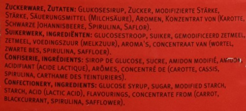 Zutaten: Glukosesirup, Zucker, modifizierte Stärke (u.a. Weizen), Säuerungsmittel (Milchsäure), Aromen, Konzentrat von (Schwarze Johannisbeere, Karotte, Spinat, Nessel).